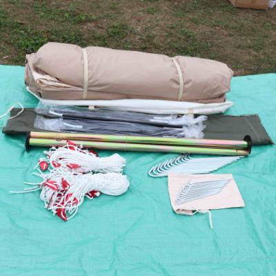 Brackets and Accessories: The tent is supported by sturdy steel tubes, and includes nails and strings for secure setup.